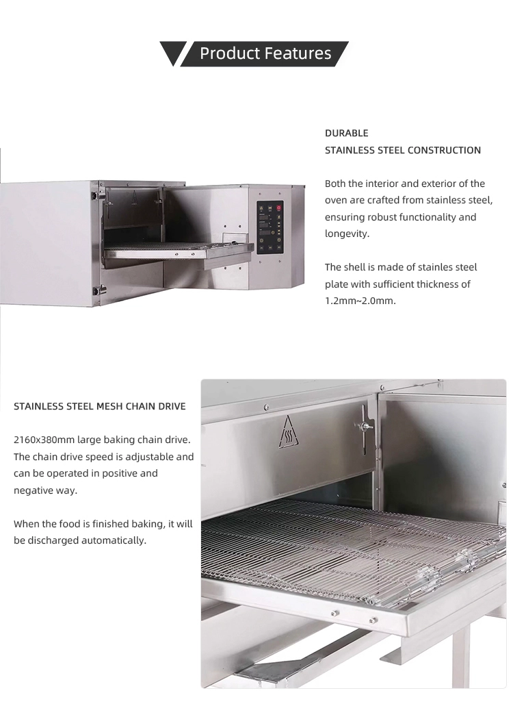 2. The chain drive can operate in both forward and reverse directions. When the food is finished baking, it will be automatically discharged.