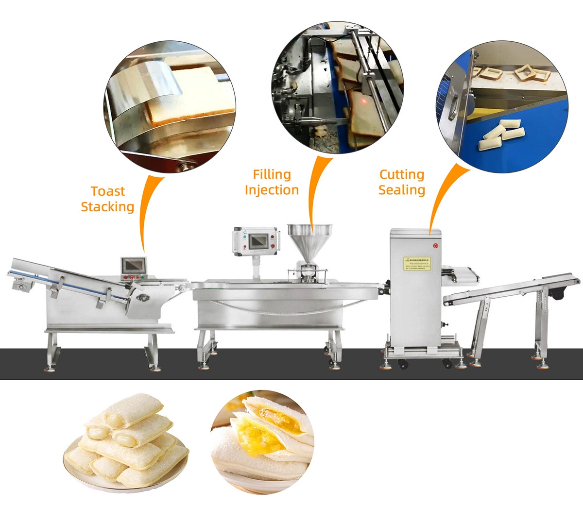 1.This pocket bread production line is designed to inject cream, jam, chocolate, and other fillings into the center of toast bread, then cut off crust edges and sealing it into a pillow-shaped finished product. It is an advanced solution for filled bakery processing.