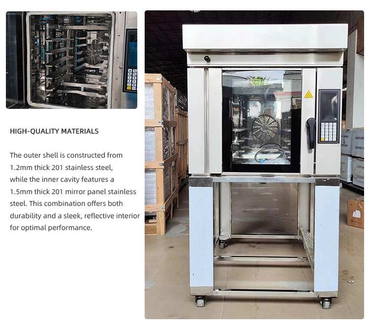 Constructed with a 1.2mm thick 201 stainless steel outer shell and a 1.5mm thick 201 mirror panel stainless steel inner cavity, this oven offers superior durability and a polished, reflective interior for optimal baking conditions.