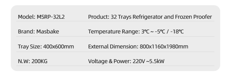 Specifications of Masbake commercial bakery machine retarder proofer models